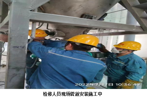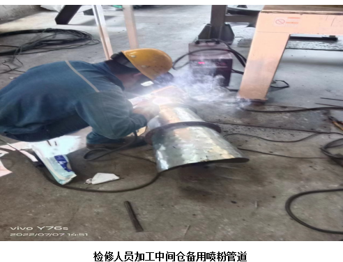 7月7日10:30分在生產(chǎn)丙班做好相關(guān)準(zhǔn)備工作后,檢修班組員在中間倉(cāng)開(kāi)始在線技改,開(kāi)孔加裝一根備用下料管道。在經(jīng)過(guò)七小時(shí)的辛苦工作后,備用下料管道順利完成。下料管道不僅可以備用,還可以在進(jìn)口SO2過(guò)高時(shí),啟動(dòng)后增加下料量,提高脫硫效率,實(shí)現(xiàn)一舉兩得!